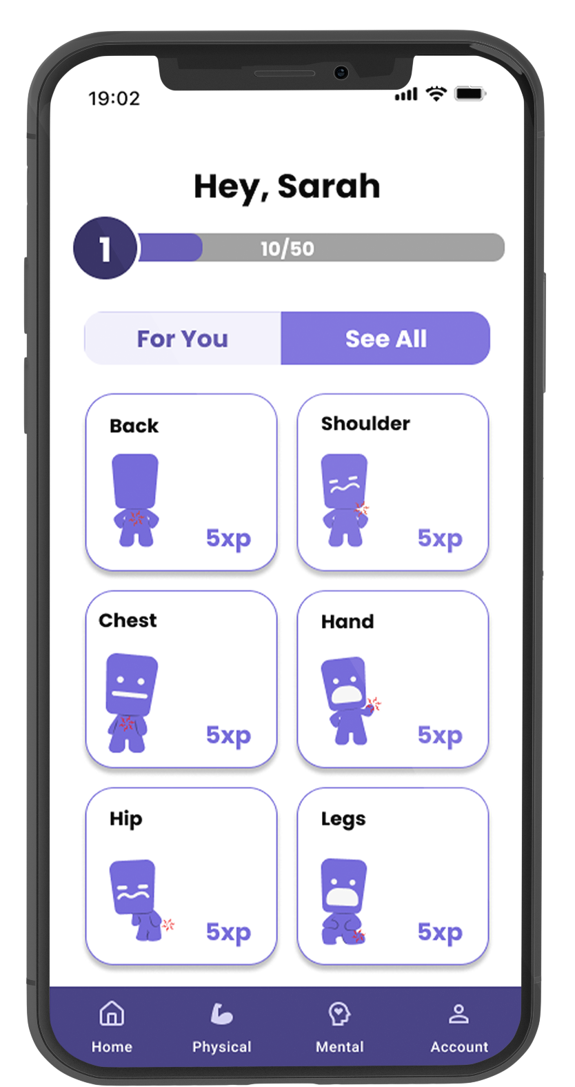 Explore a full library of categorized exercises targeting different body areas — neck, shoulders, back, legs, and more. These aren't personalized but give you freedom to explore and focus on whatever needs extra attention. Each exercise earns 5 XP, encouraging exploration and consistency.
