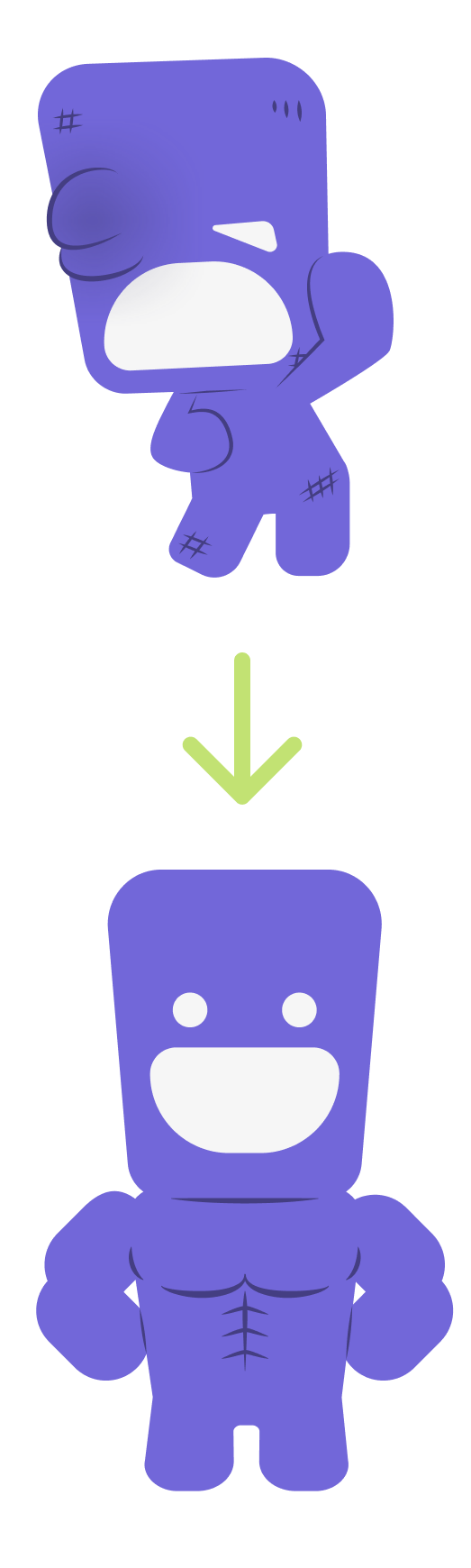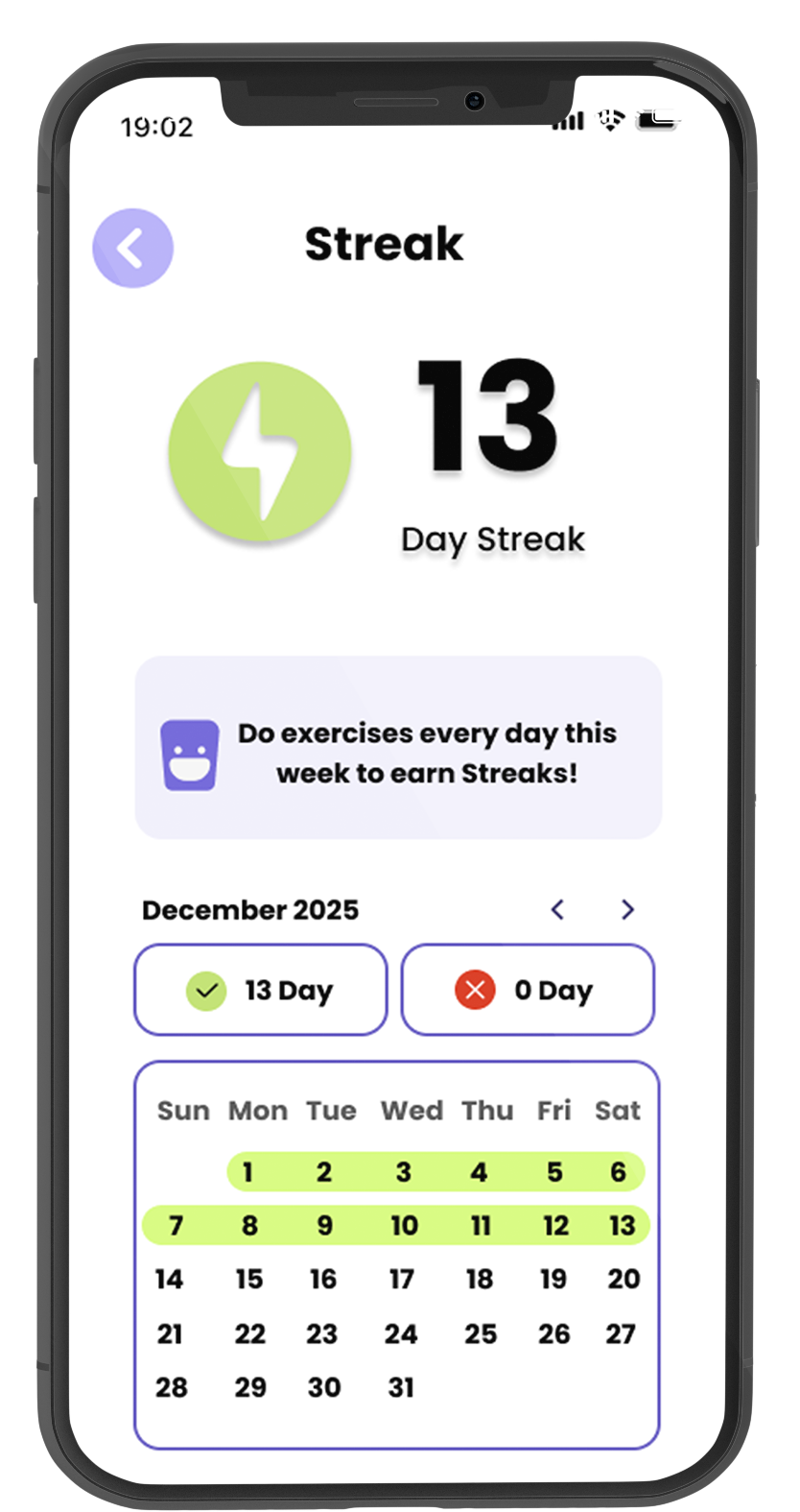 Earn XP for every activity and level up as you build better habits. Complete at least one exercise per day to maintain your streak. Missing a day breaks your streak and injures your mascot, while consistency keeps it thriving. Leveling up your mascot gives it visible progress — growing stronger, more muscular, and more resilient with you.